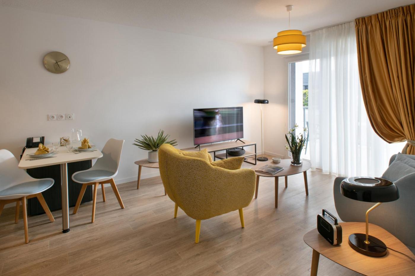 Appartement 1 Chambre. The air-conditioned apartment has 1 bedroom and 1 bathroom with a walk-in shower and a hairdryer. In the well-fitted kitchen, guests will find a stovetop, a refrigerator, kitchenware and a microwave. This wheelchair accessible apartment features a tea and coffee maker, a seating area with a flat-screen TV and a roll-in shower. The unit has 1 bed. ;