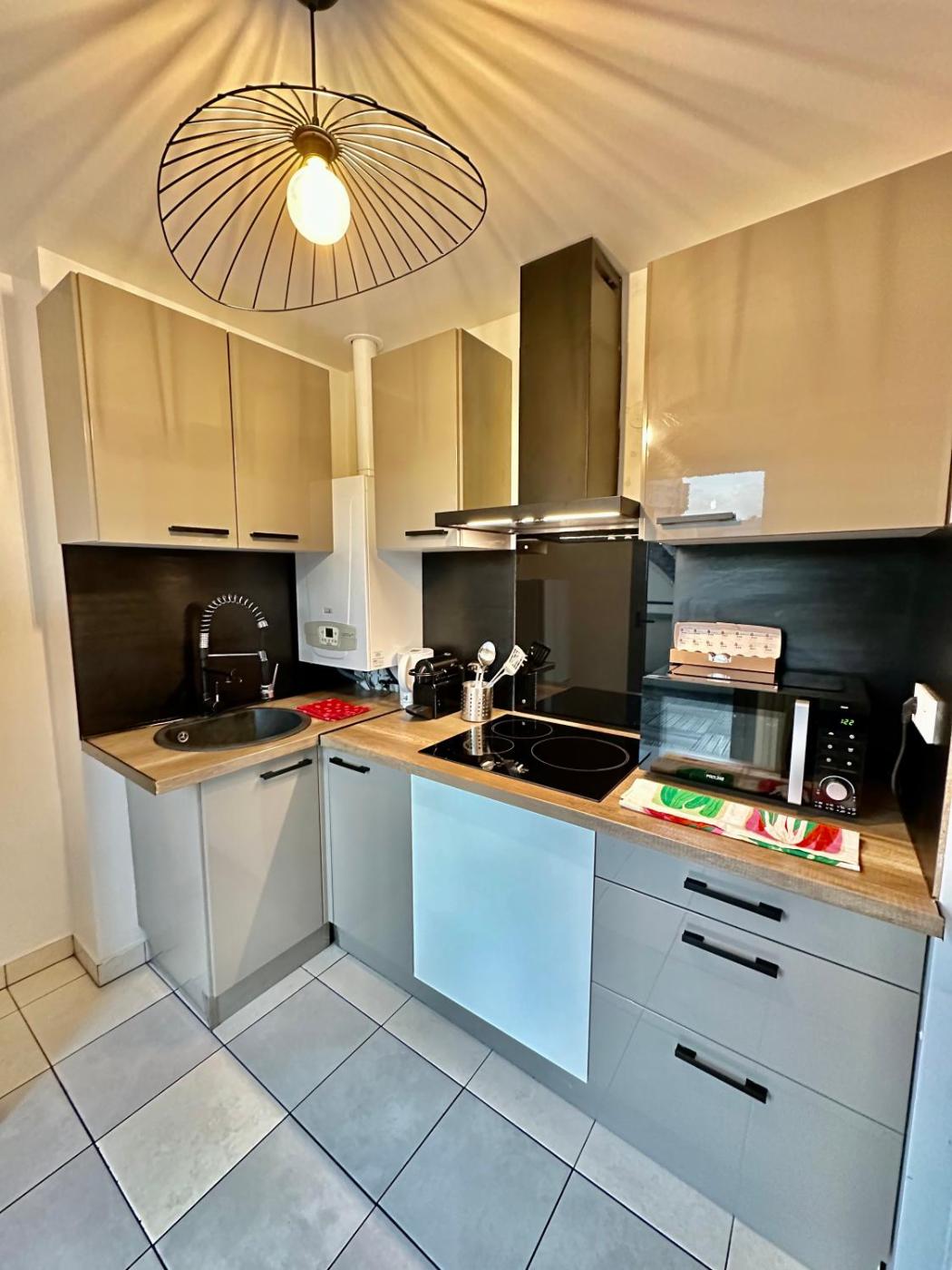 Appartement 2 Chambres. The well-fitted kitchen has a stovetop, a refrigerator, kitchenware and a microwave. The spacious apartment features a flat-screen TV with streaming services, a private entrance, a coffee machine, a seating area as well as city views. The unit has 3 beds.