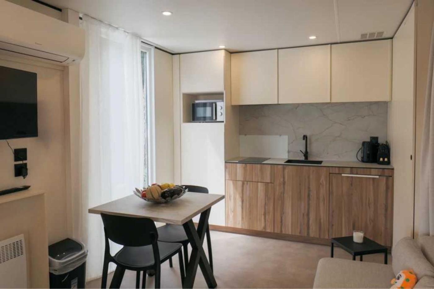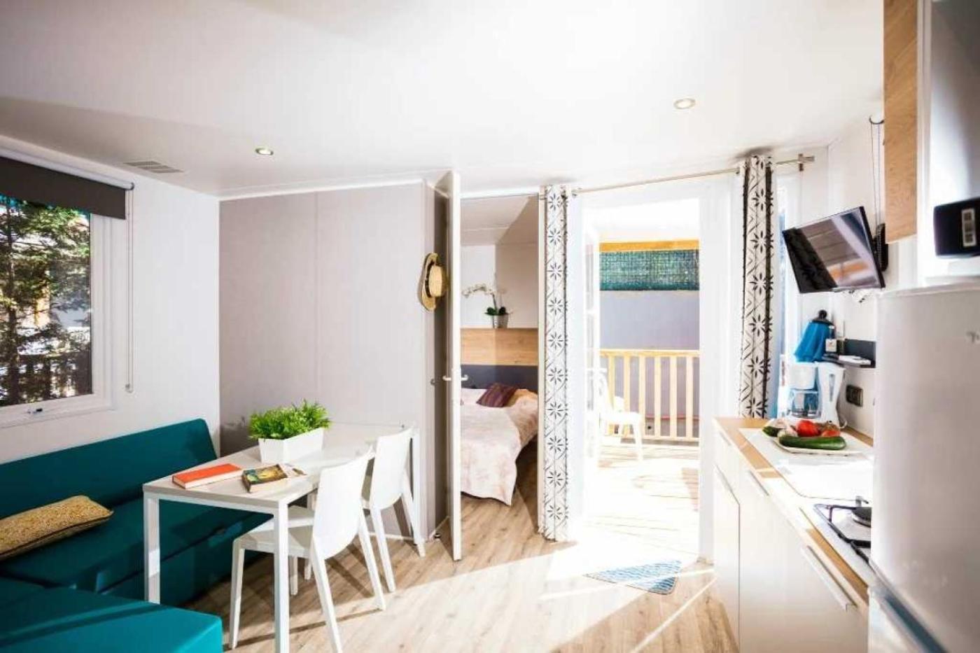 Mobile Home 2 Chambres. Boasting a private entrance, this air-conditioned mobile home features 2 bedrooms and 1 bathroom with a shower. Meals can be prepared in the well-fitted kitchen, which has a refrigerator, kitchenware and a microwave. Featuring a terrace, this mobile home also features tumble dryer, heating and a TV. The unit has 3 beds. ;