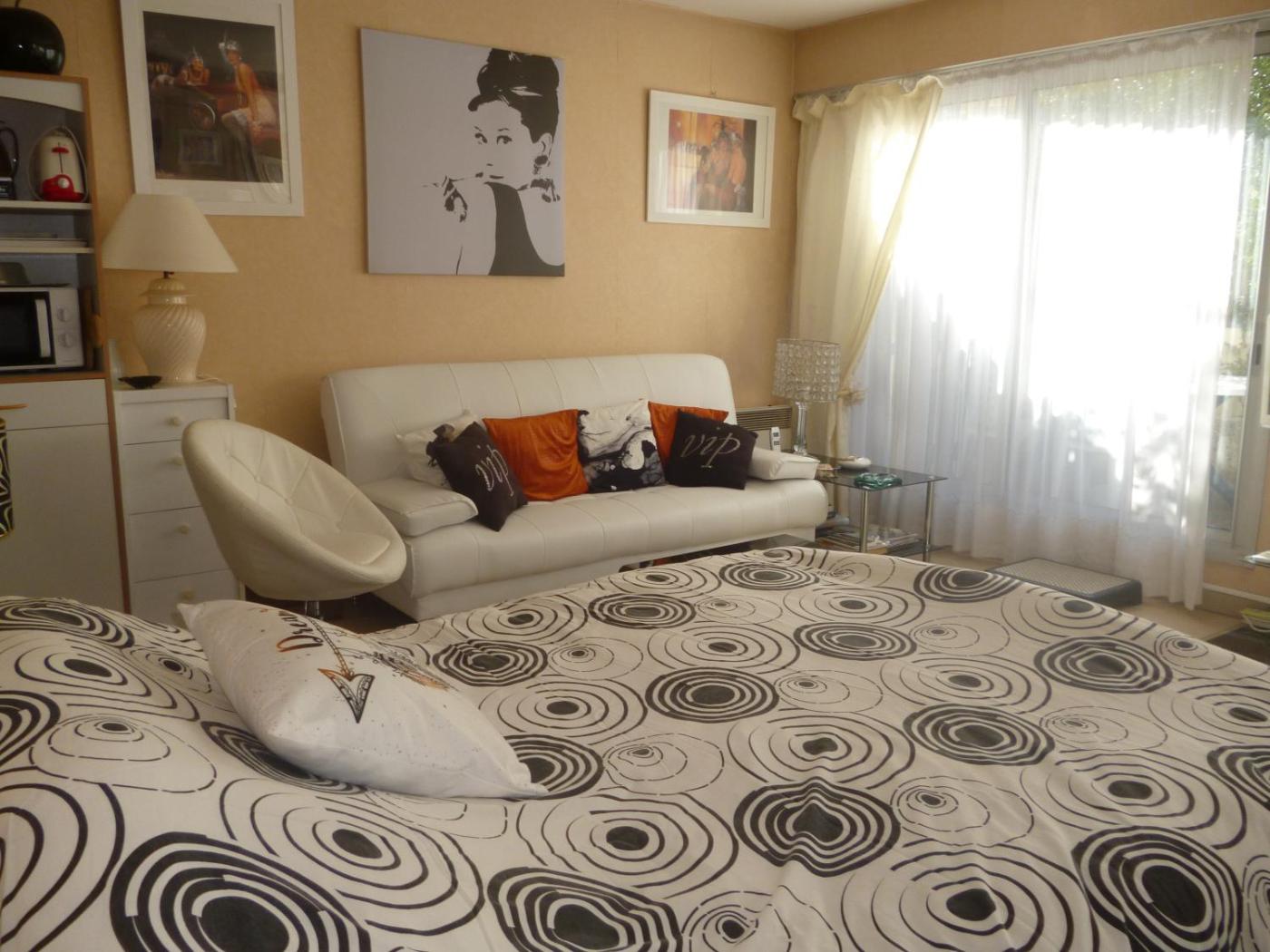 Studio avec Terrasse. Situé en rez-de-jardin, ce studio dispose dun lave-vaisselle, dustensiles de cuisine et dun canapé. ;