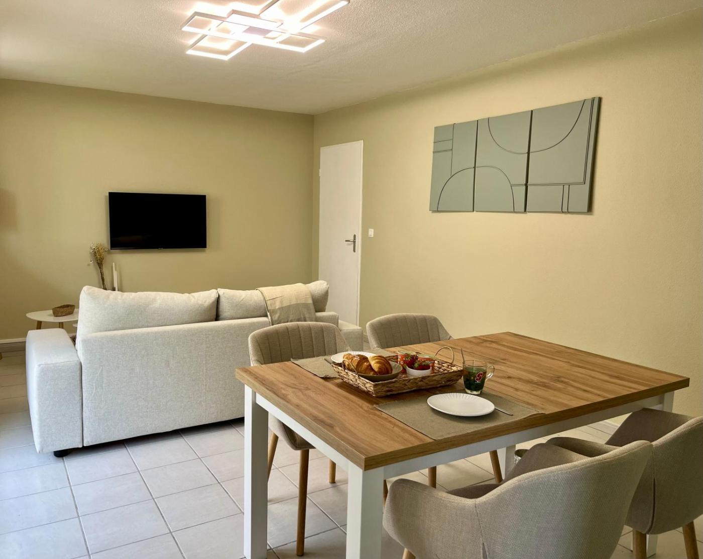 Appartement 1 Chambre. This apartment consists of 1 living room, 1 separate bedroom and 1 bathroom with a bath and a shower. Guests can make meals in the kitchen that is equipped with a stovetop, a refrigerator, a dishwasher and kitchenware. Featuring a terrace with garden views, this apartment also provides a washing machine and a flat-screen TV with streaming services. The unit offers 2 beds.