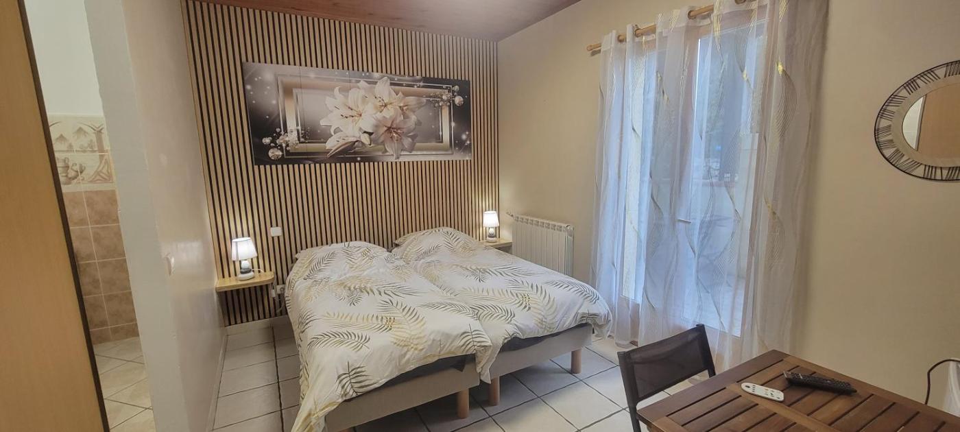Chambre Double ou Lits Jumeaux. This double room opens onto the garden and features a terrace with views of Peyrepertuse and Queribus castles.