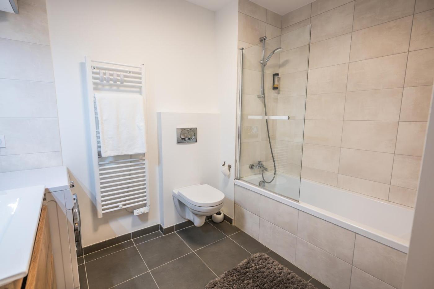 Appartement 2 Chambres. This apartment includes 1 living room, 2 separate bedrooms and 2 bathrooms with a walk-in shower and a bath. The well-fitted kitchen has a stovetop, a refrigerator, a dishwasher and kitchenware. Boasting a balcony with city views, this apartment also offers a washing machine and a flat-screen TV. The unit has 4 beds.