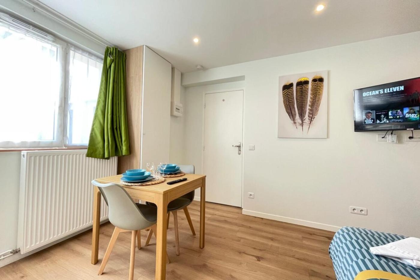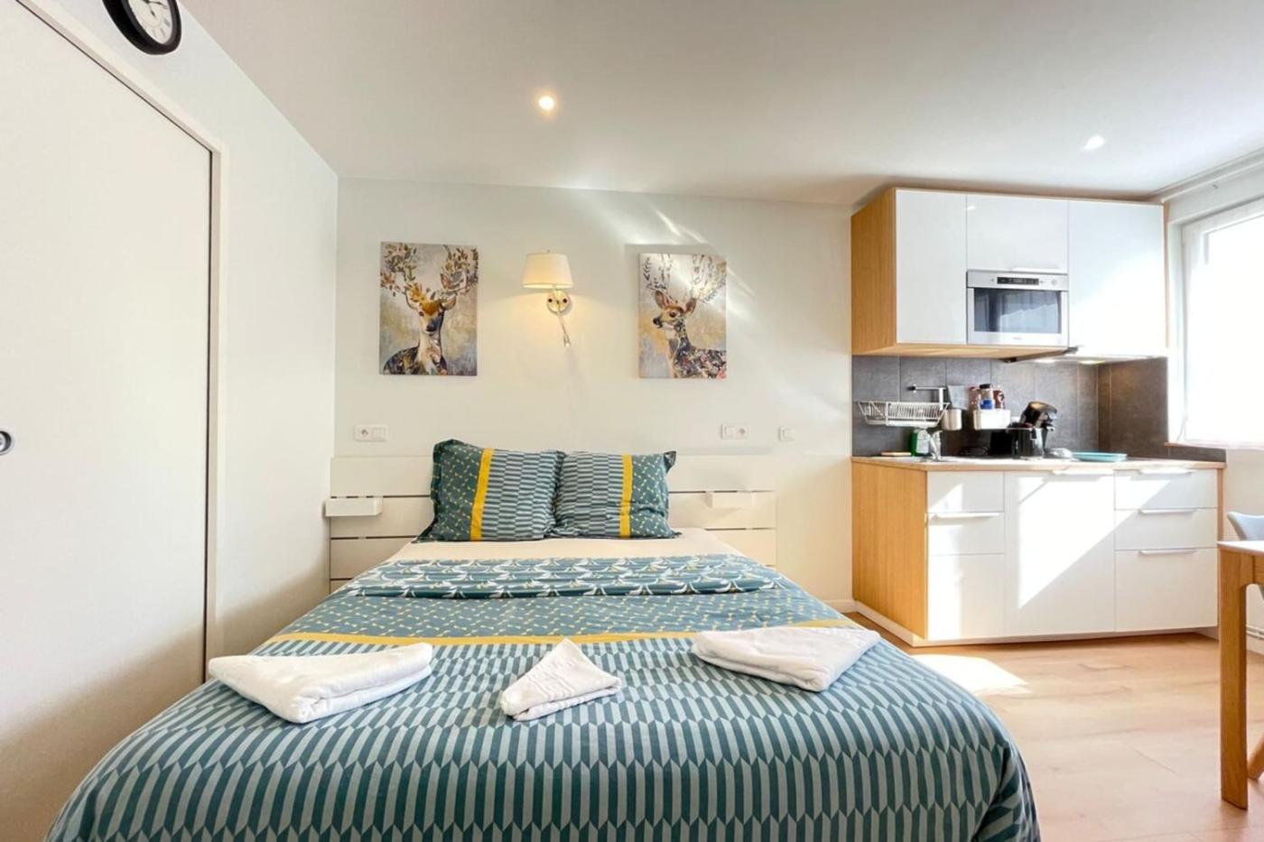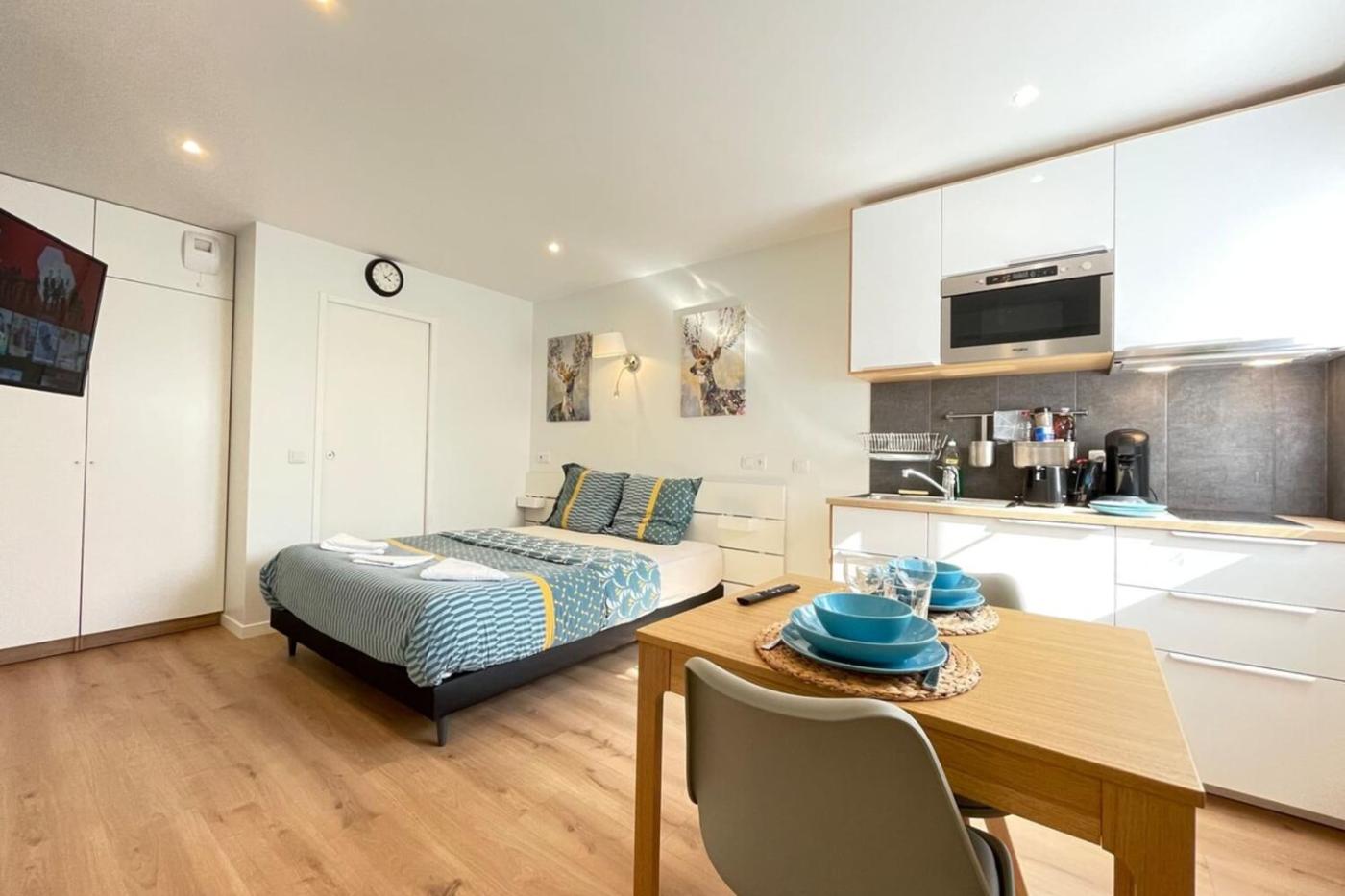 Appartement. Cet appartement comprend un lave-linge et une machine à café. La salle de bains privative est pourvue d’une baignoire ou d’une douche ainsi que d’un sèche-cheveux. Vous pourrez préparer vos repas dans la cuisine équipée de plaques de cuisson, dun réfrigérateur, dun four et d’ustensiles. Cet appartement comprend un coin salon avec une télévision, un coin repas et une terrasse. Ce logement comporte 1 lit.