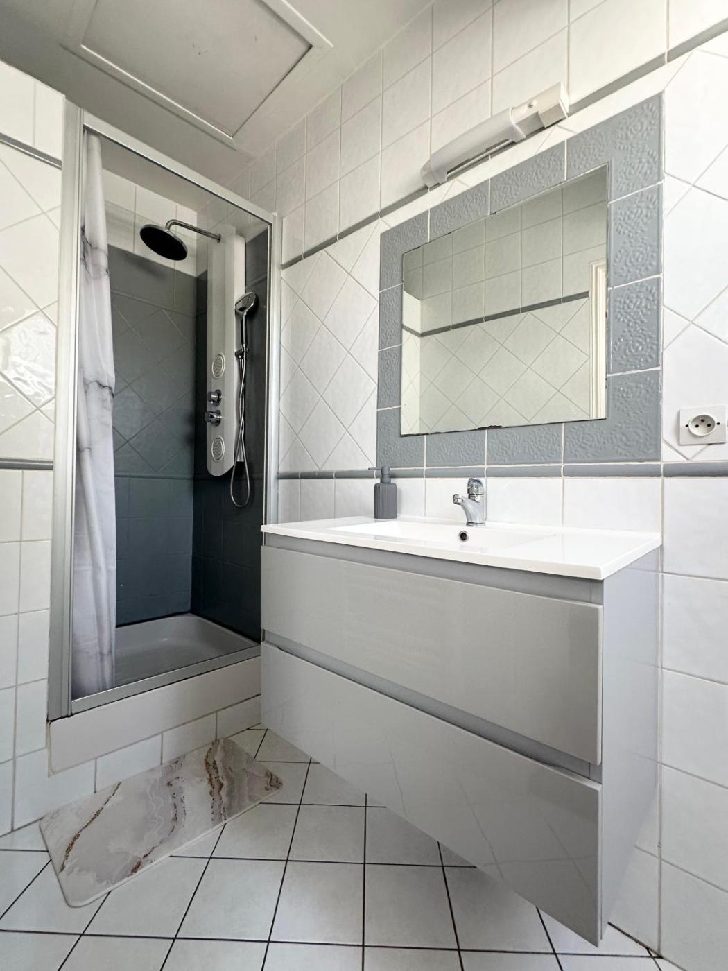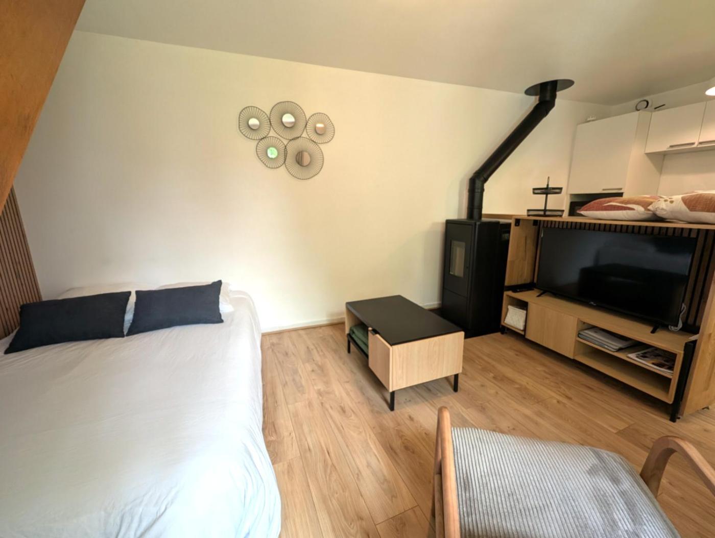 Appartement 1 Chambre. Boasting a private entrance, this apartment includes 1 living room, 1 separate bedroom and 1 bathroom with a shower and a hairdryer. The well-equipped kitchen has a stovetop, a refrigerator, a dishwasher and kitchenware. Featuring a terrace with garden views, this apartment also offers a tea and coffee maker and a flat-screen TV. The unit has 2 beds.