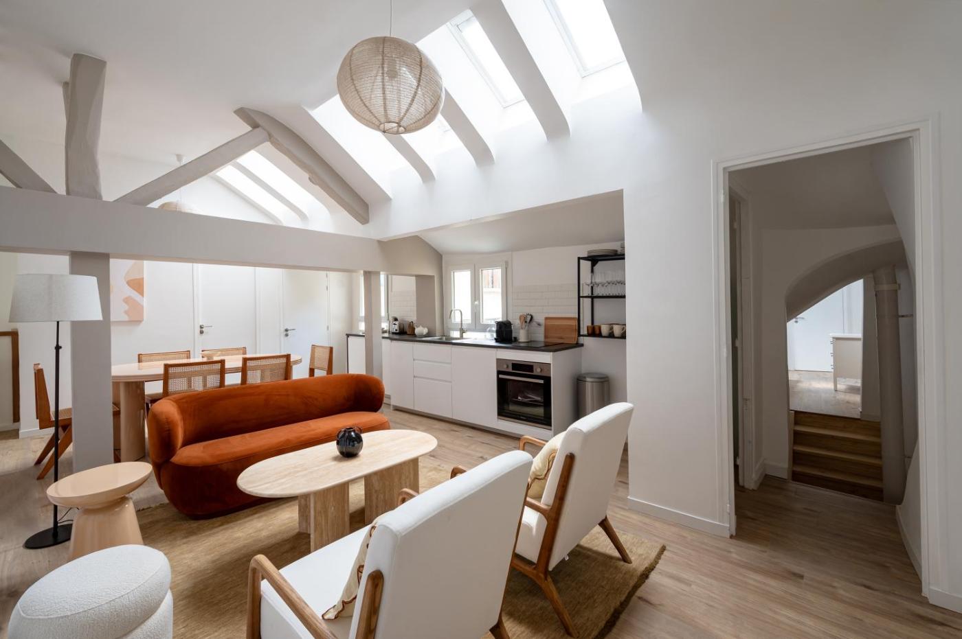 Appartement 3 Chambres. Boasting a private entrance, this spacious apartment also features 3 bedrooms, a seating area and 2 bathrooms with a shower and a hairdryer. In the well-fitted kitchen, guests will find a stovetop, a refrigerator, a dishwasher and kitchenware. The air-conditioned apartment features a flat-screen TV, a washing machine, soundproof walls, a coffee machine as well as city views. The unit has 4 beds.
