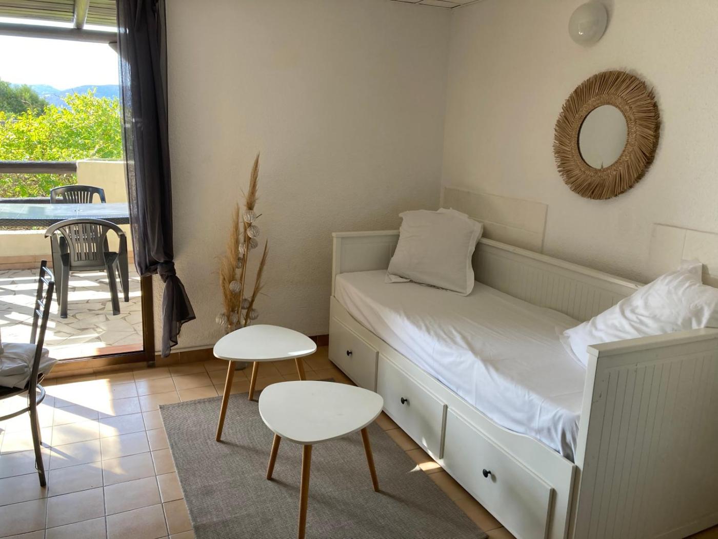 Maisonnette. This small house includes: A bedroom with a double bed and access to a balcony offering sea and mountain views; - A sleeping area with a sofa bed; - A bathroom with a shower and a washing machine; - A kitchen equipped with a stovetop, a fridge, a microwave, kitchenware and a coffee machine; - A dining area; - A furnished terrace with a barbecue.
