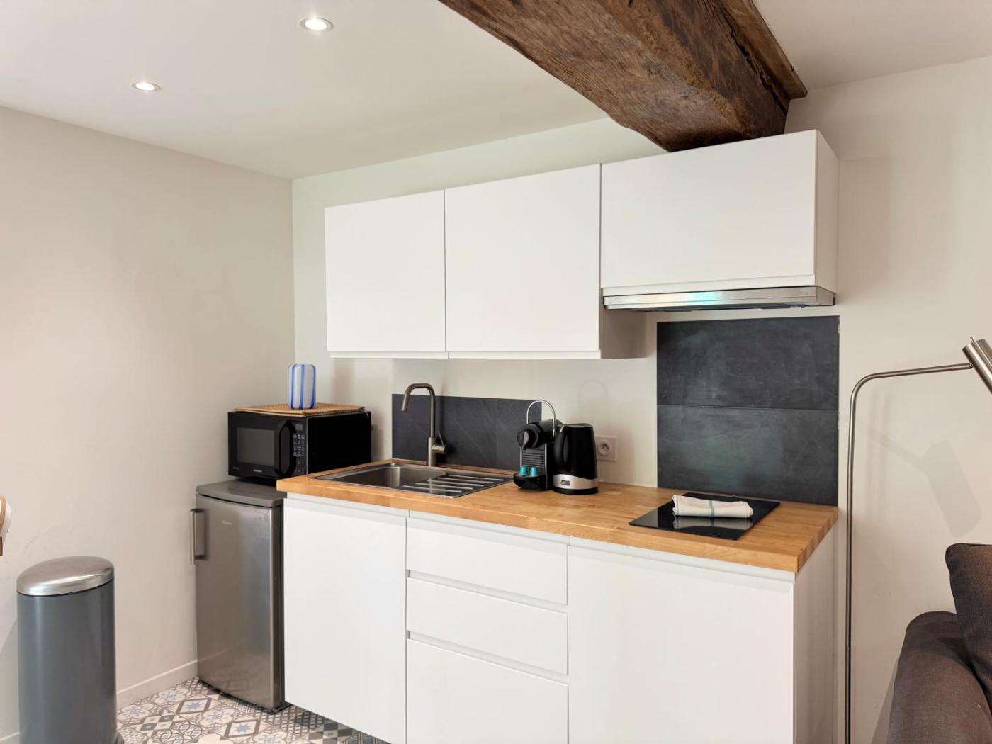Appartement 1 Chambre. Featuring a private entrance, this apartment also comprises 1 separate bedroom, 1 bathroom with a shower, a kitchenette and a dining area. Guests can make meals in the kitchenette that comes with a stovetop, a refrigerator, kitchenware and a microwave. The apartment provides a washing machine, a tea and coffee maker, a wardrobe, a TV, as well as ancourtyard view. The unit offers 1 bed.