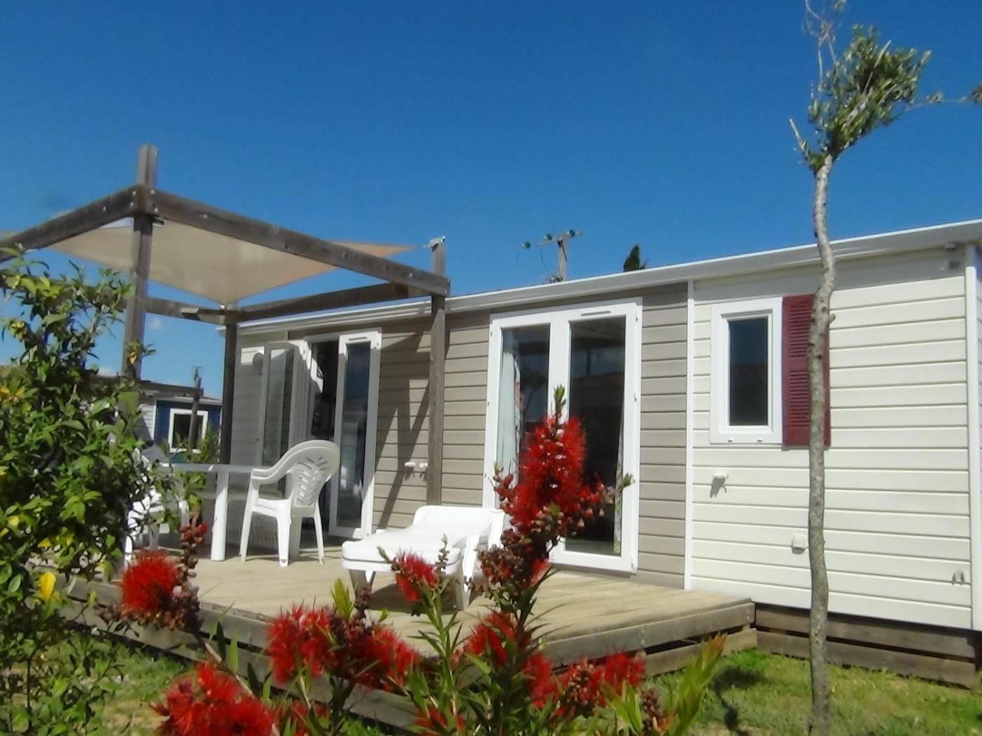 Mobile Home. This air-conditioned mobile home is comprised of 1 living room, 3 separate bedrooms and 1 bathroom with a shower. Guests will find a stovetop, a refrigerator, a dishwasher and kitchenware in the kitchen. The mobile home also has a barbecue. There is a coffee machine, a seating area and a terrace and complimentary winechampagne is featured for guests. The unit offers 5 beds. ;