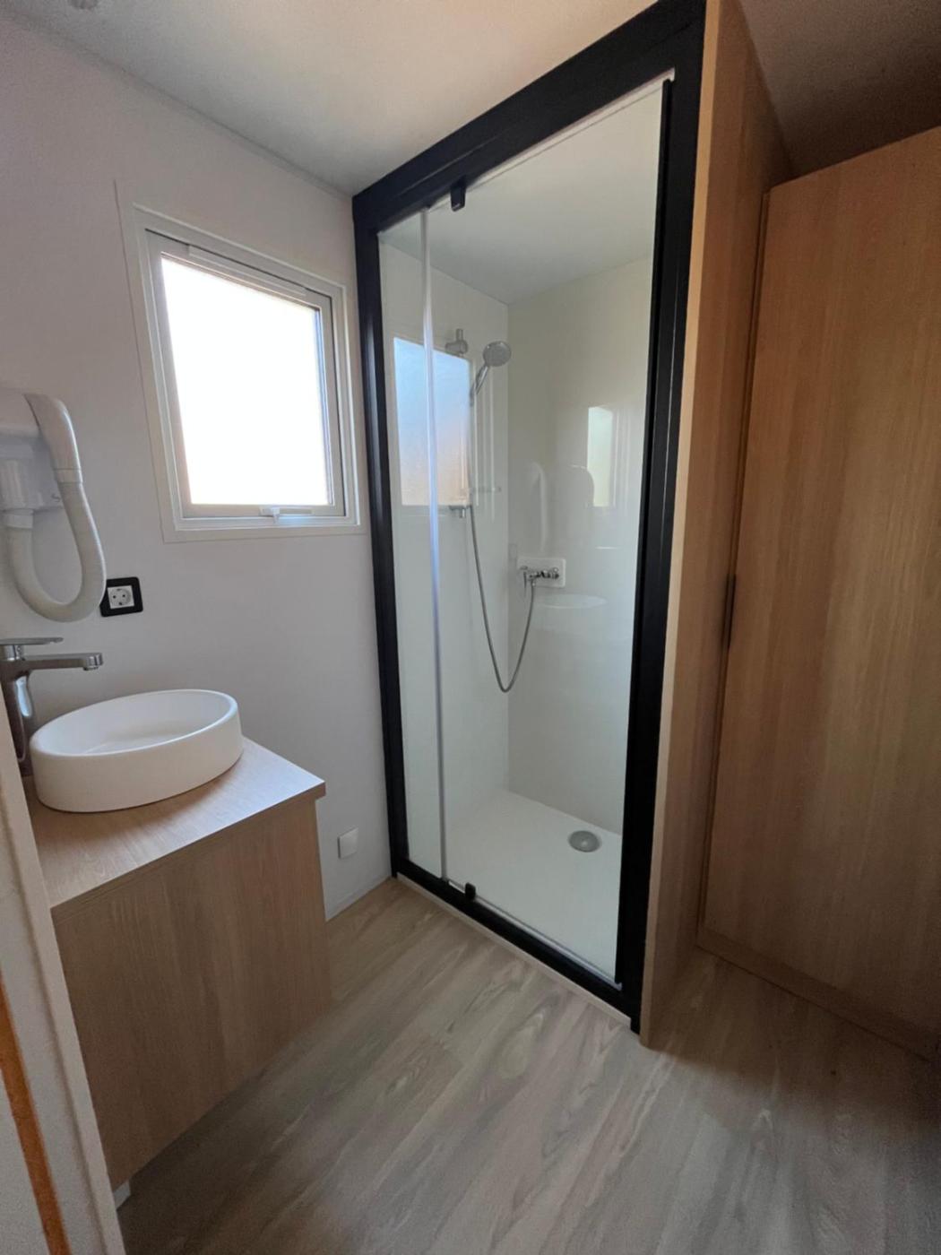 Mobile Home. This air-conditioned mobile home features 1 living room, 3 separate bedrooms and 1 bathroom with a shower. The well-fitted kitchen has a stovetop, a refrigerator, a dishwasher and kitchenware. Boasting a terrace, this mobile home also features a coffee machine, a seating area and a TV. The unit has 5 beds.
