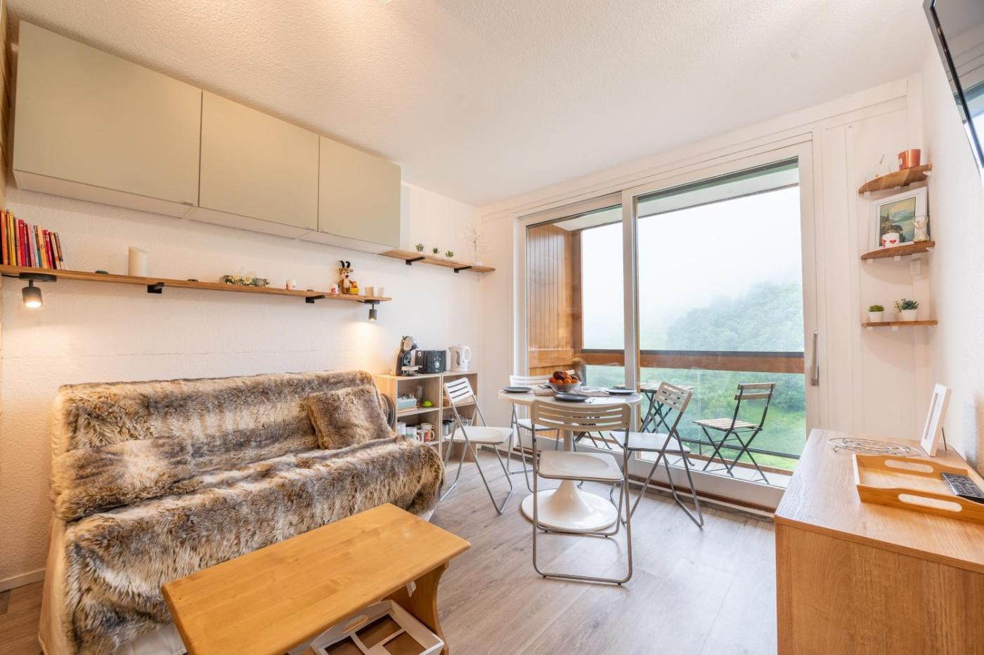 Studio - Vue sur Montagne. Guests can make meals in the kitchen that features a refrigerator, a dishwasher, kitchenware and an oven. The studio features a washing machine, a tea and coffee maker, a balcony with mountain views as well as a private bathroom boasting a shower. The unit has 3 beds.